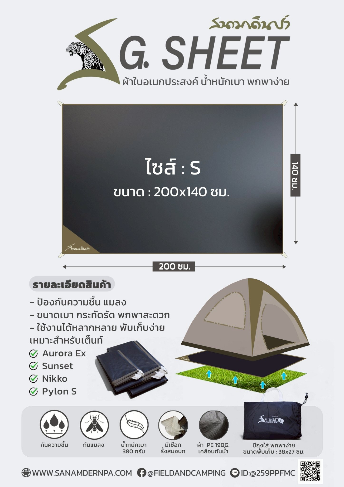 วัสดุ : ผ้า PE 190g เคลือบกันน้ำ มีเชือรั้งสมอบก มีถุงใส่พร้อมหูรูด เพื่อสะดวกในการใช้งาน สามารถใช้บังแดดหรือปูรองพื้นกันความชื้นได้