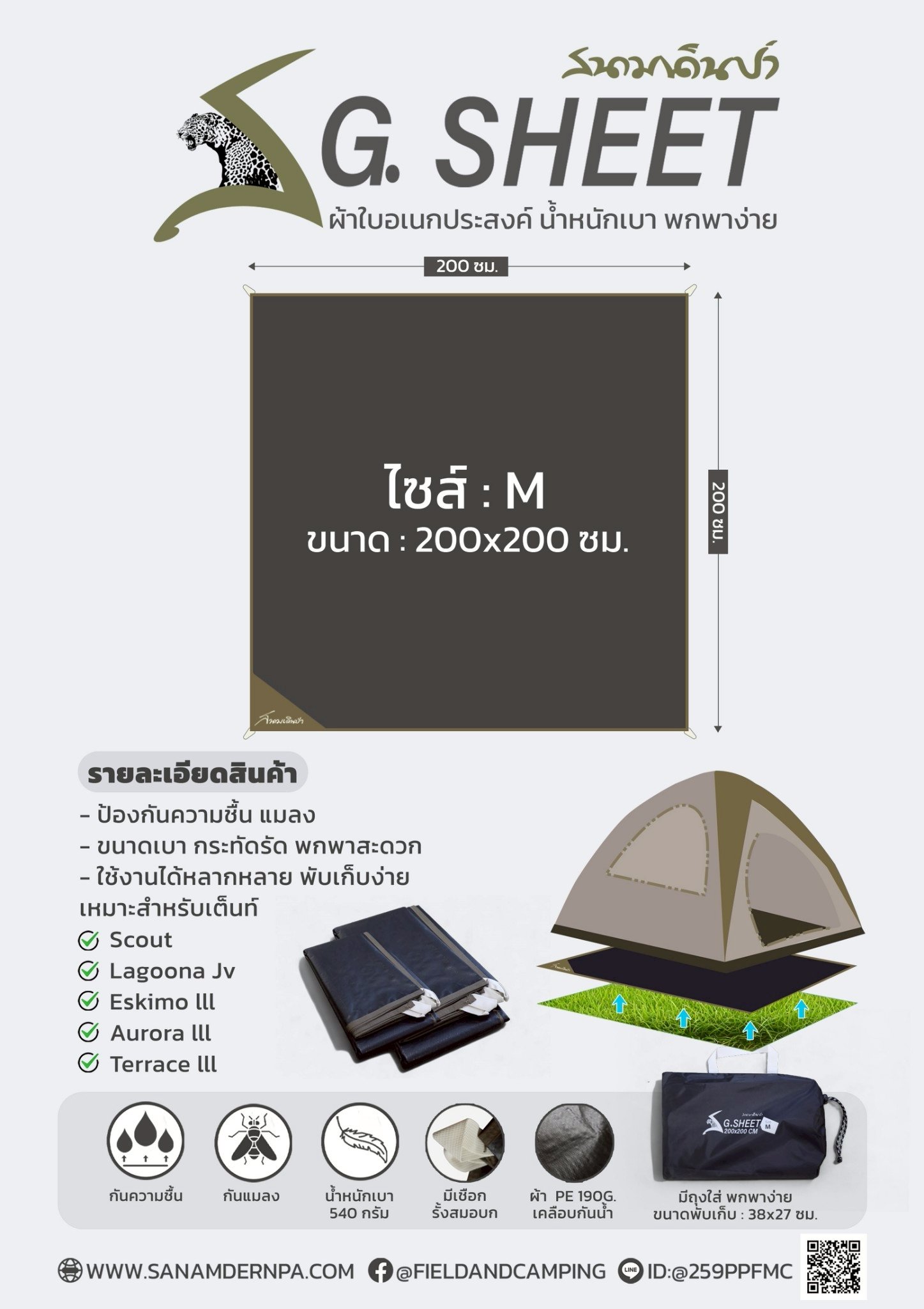 วัสดุ : ผ้า PE 190g. เคลือบกันน้ำ มีเชือรั้งสมอบก มีถุงใส่พร้อมหูรูด เพื่อสะดวกในการใช้งาน สามารถใช้บังแดดหรือปูรองพื้นกันความชื้นได้